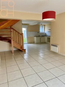 Il se compose d’une pièce de vie ouverte sur une cuisine partiellement aménagée et équipée, d’un grand cellier, d’un dégagement avec placards et WC. À l’étage, un pallier dessert 3 chambres dont une avec placards et une salle de bains avec WC.